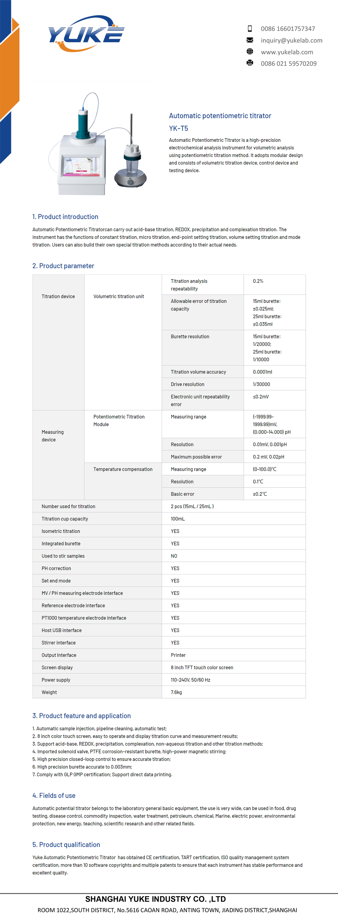 Yuke Automatic Potentiometric Titrator has obtained CE certification, TART certification, ISO quality management system certification, more than 10 software copyrights and multiple patents to ensure that each instrument has stable performance and excellent quality.
